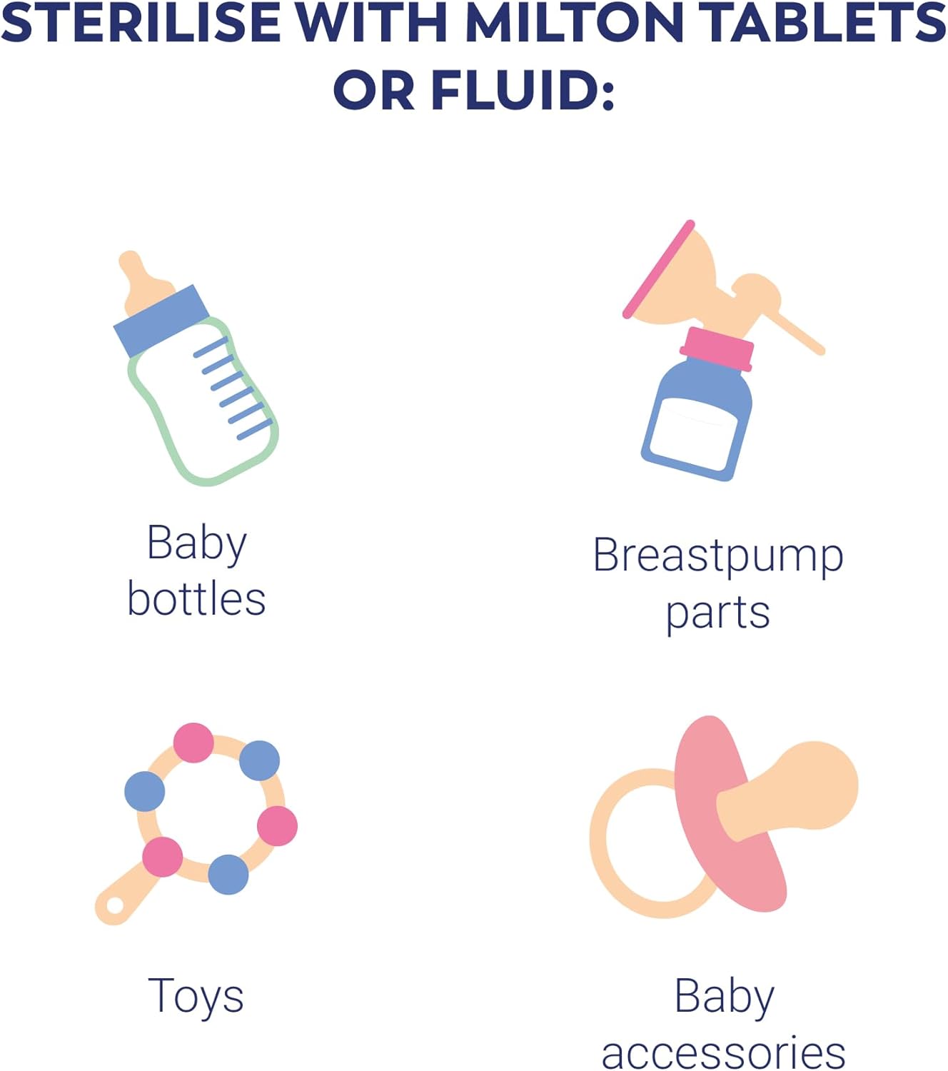 Product Description Used by health professionals on maternity wards, the Milton Cold Water Steriliser is the safe and reliable, electricity-free way to sterilise all your baby feeding accessories and breastfeeding equipment. Used with either Milton Sterilising Tablets or Milton Sterilising Fluid, the steriliser is , for plastic cutlery, weaning bowls, breast pump parts, soothers, teething rings and even small plastic toys. While the large 5L capacity can hold up to 5 wide-neck baby bottles at a time. The specially designed lid ensures the solution is protected. And a submerger keeps all the items in the solution. And when you’re finished, emptying the solution is easy thanks to the pouring spout. A must have, a very simple and effective way to sterilise. Trusted by midwives for over 70 years. Award Winning - Good Housekeeping Institute Approved 2025. Box Contains 1 x Milton Cold Water Steriliser 1 x Weighted grid Manufacturer Contact Information Milton Pharmaceutical Company Uk Ltd, 41 Rodney Road, Cheltenham, Gloucerstershire, GL50 1HX, UK See more