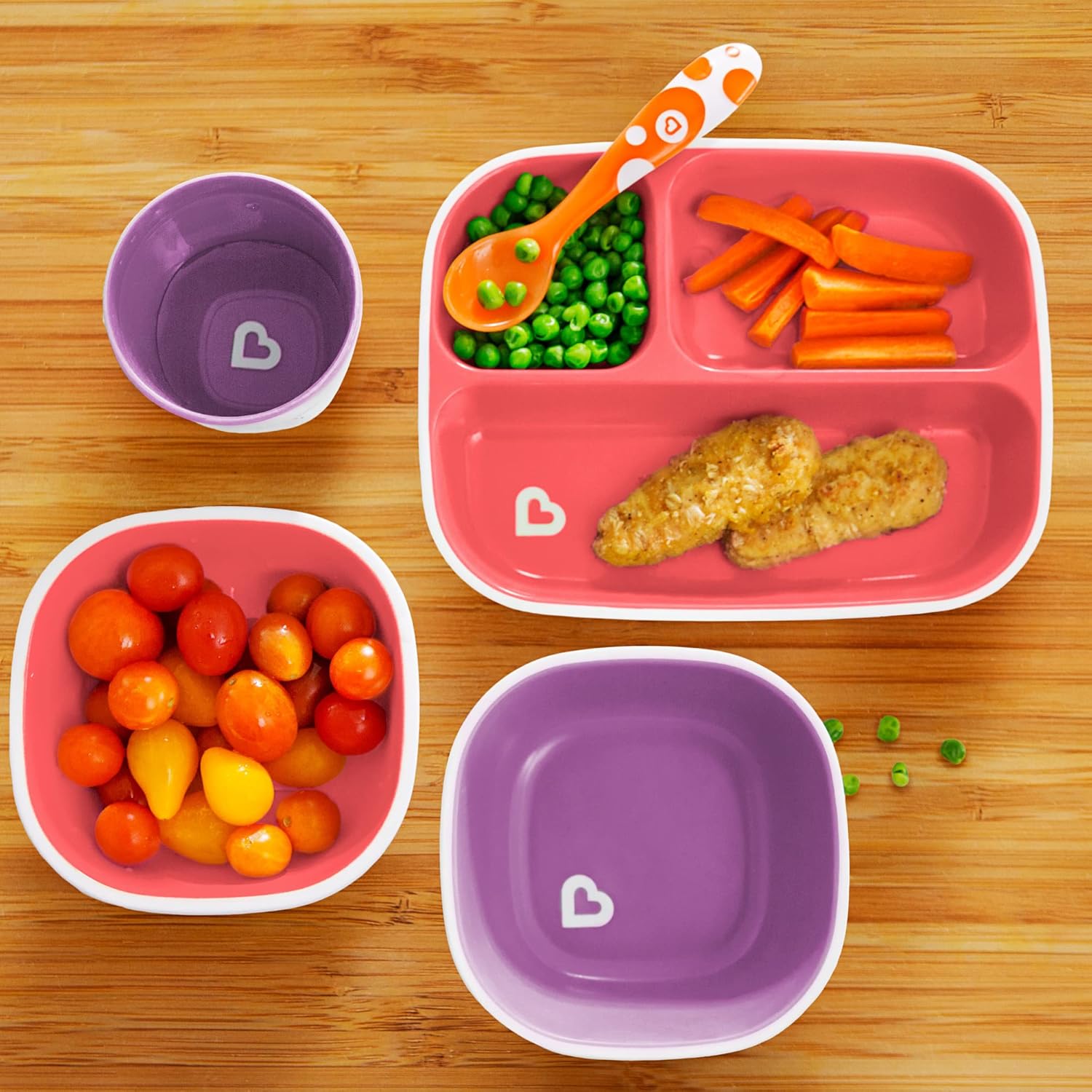 Brand: Visit the Munchkin Store. Category: Baby Products, Nursing & Feeding, Tableware, Sets. Shipping Price: 0.0. MUNCHKIN BOWL AND PLATE SET: An essential baby food set with 2 children's plates and 2 toddler bowls. The ideal baby weaning bowl and baby weaning plate set, or for toddler snacks and meals every day. KIDS DIVIDED PLATES FOR BABY LED WEANING: Three separate compartments for weaning or serving different foods, with deep walls for easy scooping. Sectioned plates mean kids can spoon feed independently. TODDLER DINING SET WITH HANDY BOWLS: The matching baby and toddler bowls are perfect for cereal, pasta, fruit, purees and desserts. Modern design with white exterior and brightly-coloured interiors. BPA FREE AND EASY TO CLEAN: Safe, non toxic toddler plates and dishes. Top-shelf dishwasher safe. Microwave safe and stackable for easy storage. Child's plate for infants 6+ months to older children. DISCOVER THE MUNCHKIN BABY FEEDING SETS: Complete your toddler's dinnerware collection with our spoons, baby bowls and sippy cups, as well as Munchkin infant feeding accessories and baby weaning sets